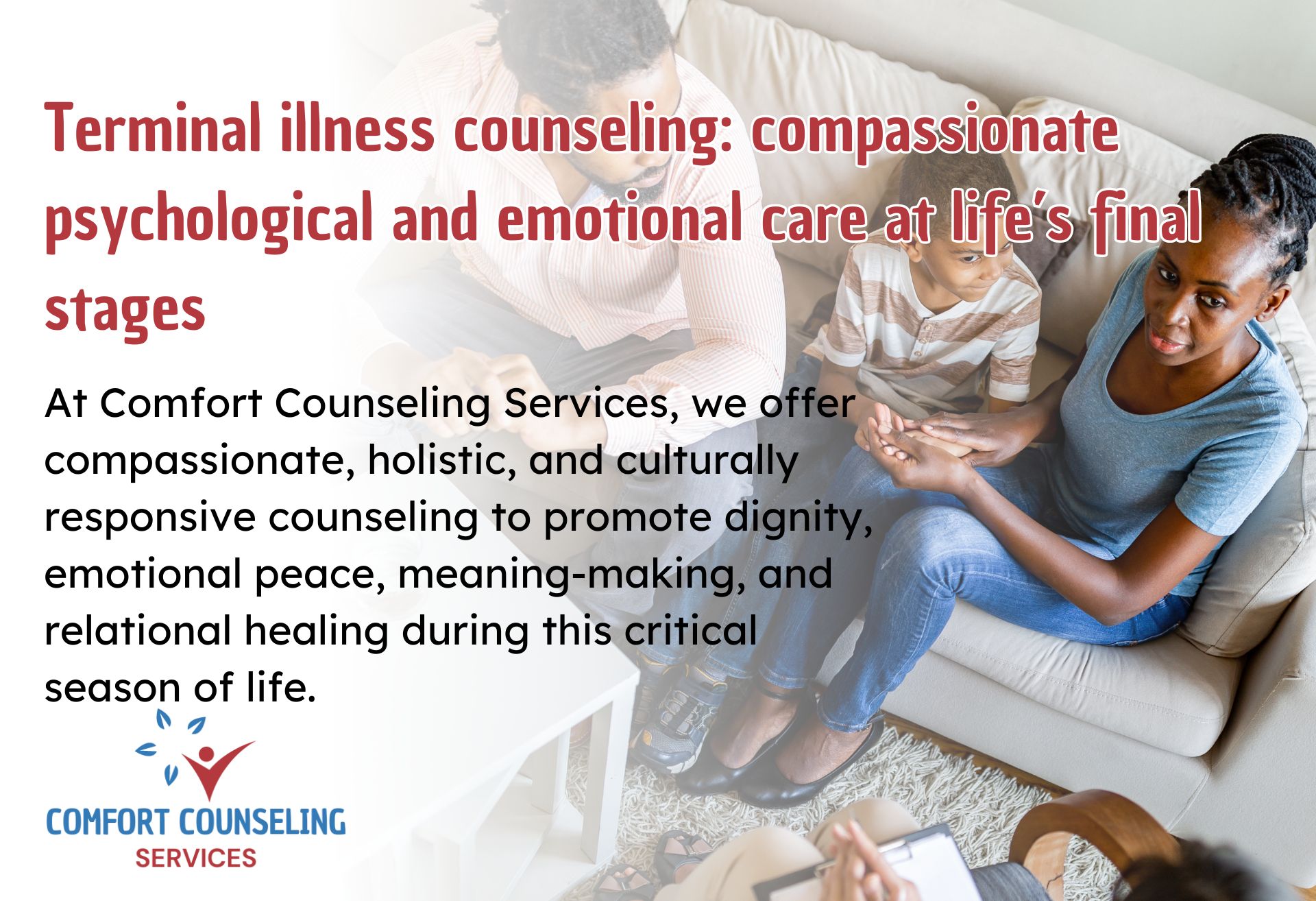 If you or a loved one is navigating terminal illness, Comfort Counseling Services is here to walk with you—providing comfort, understanding, and hope when it is needed most.